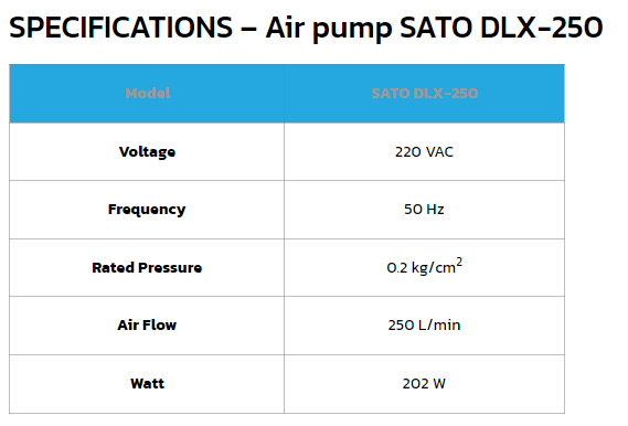 เครื่องเติมอากาศ SATO รุ่น DLX-250 (Air Pump) กำลังลม 250 ลิตร/นาที กำลังไฟ 202 W